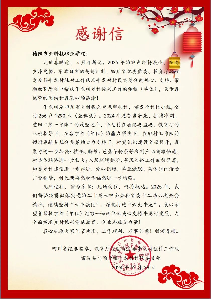 12月28日,四川省纪委监委、省教育厅派驻雷波县牛龙村驻村工作队及雷波县马颈子镇牛龙村村民委员会向我校发来感谢信。信中对我校在帮扶四川省乡村振兴重点帮扶村——雷波县牛龙村方面所作出的积极努力和贡献,特别是在推动雷波县经济发展、提升当地民众生活水平、为全面实现乡村振兴目标所付出的辛勤付出,表达了诚挚的谢意。同时,在迎接2025年之际,向我校全体师生致以最崇高的祝福。