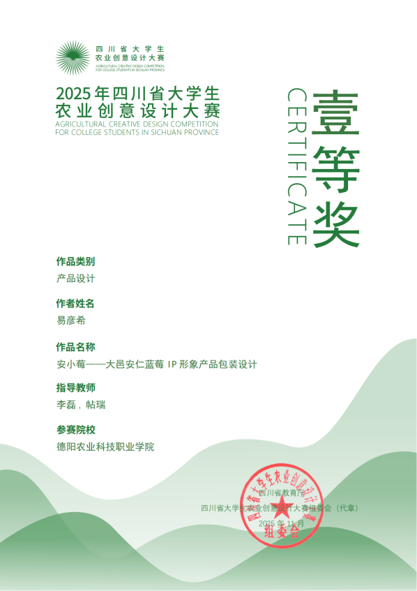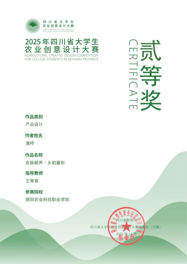 近日,由四川省教育厅、农业农村厅联合主办,四川农业大学承办的“2025年四川省大学生农业创意设计大赛”圆满落幕。我校教师指导团队凭借丰富的专业赛事指导能力,为学生提供了从创意构思到设计表达的全方位支持,在他们的精心指导下,学生团队共斩获一等奖 2 项、二等奖 2 项、三等奖 10 项,成绩斐然。