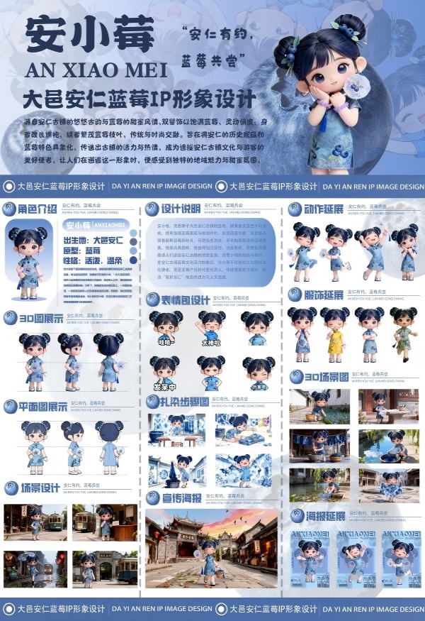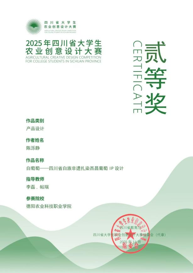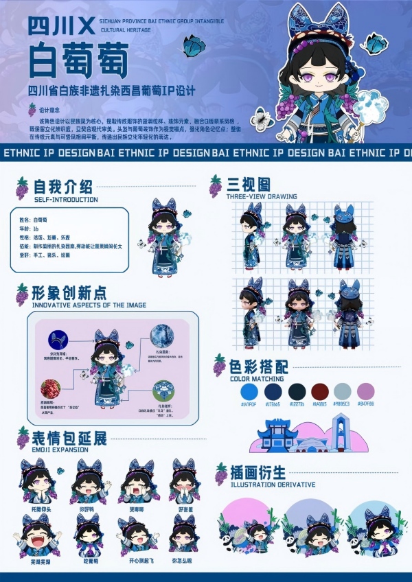 我校获奖作品中,聚焦四川特色农业资源与非遗文化的创意设计尤为引人注目:易彦希同学的《安小莓——大邑安仁蓝莓IP形象产品包装设计》,巧妙地将地方特产与IP形象相结合,用现代设计赋能传统农业市场竞争力;陈泺静同学的《白葡萄——四川省白族非遗扎染西昌葡萄IP设计》,则巧妙融合民族技艺与果品形象,探索文化传承的新载体。陈超、席燕等参赛同学的作品围绕区域农产品进行了系统化、品牌化的创意表达,也得到了众多点赞。