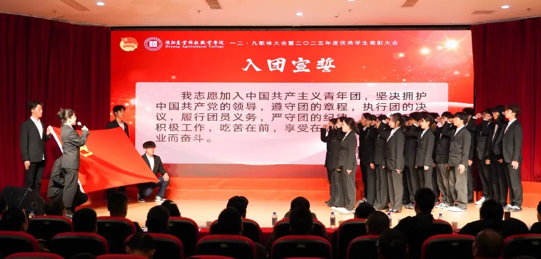 共青团德阳农业科技职业学院委员会副书记叶柯领誓。青春向党,誓言铮铮,我们共同见证2025-2026学年上期新团员入团仪式。