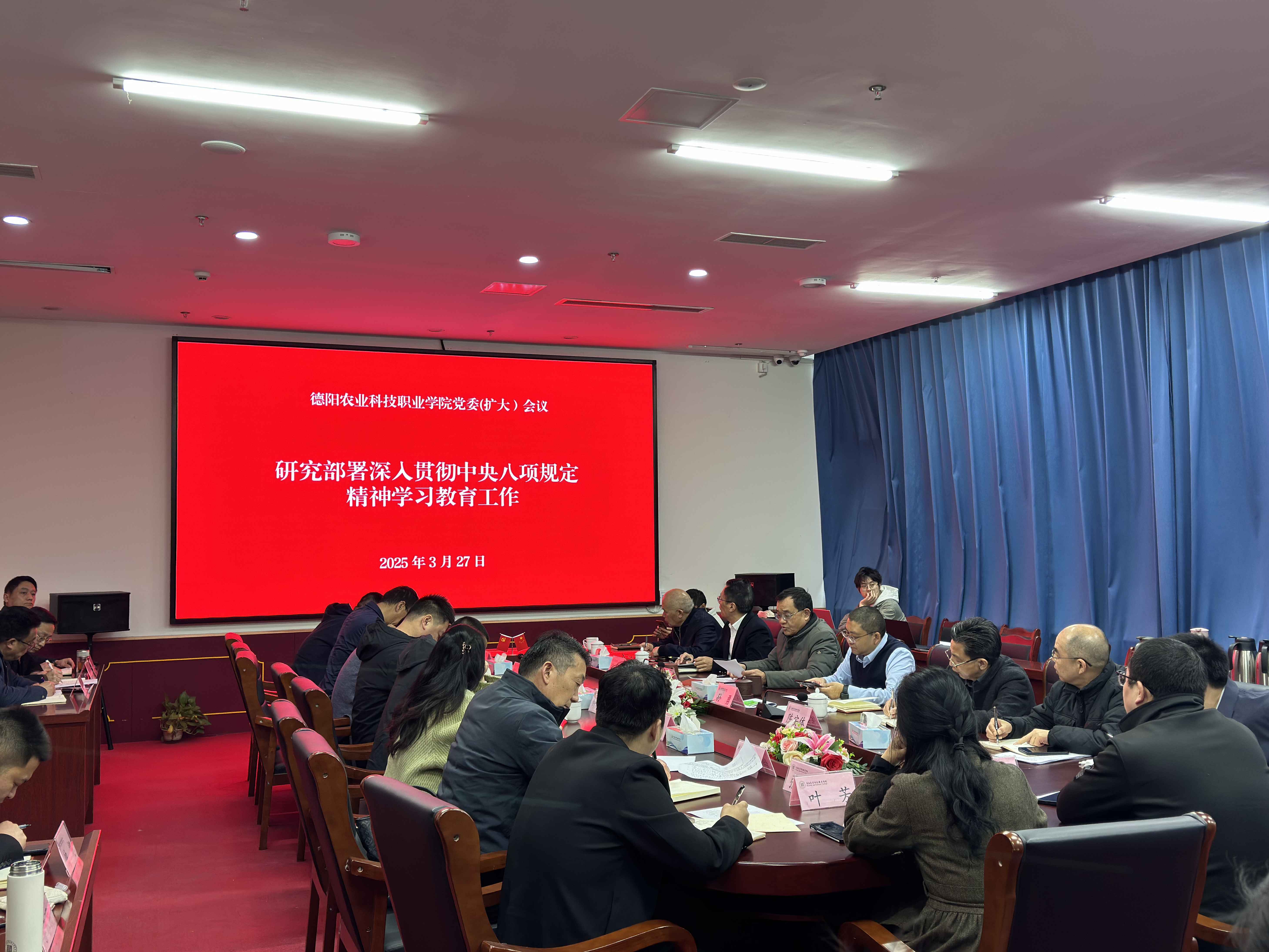 会上,学习了习近平总书记有关重要讲话和中央党的建设工作领导小组3月12日会议精神,学习了《关于改进工作作风、密切联系群众的八项规定》以及《中央八项规定实施细则》。会上,夏洪波代表学校党委作了题为《扎实开展深入贯彻中央八项规定精神学习教育推动作风建设在德阳农科走深走实》的动员讲话。