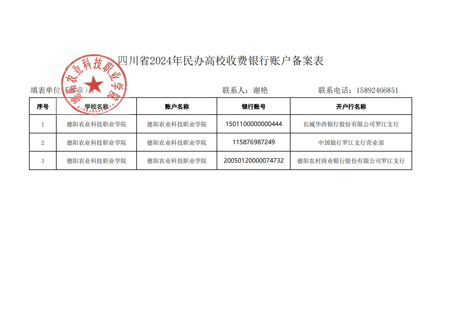 四川省 2024 年民办高校收费银行账户备案表