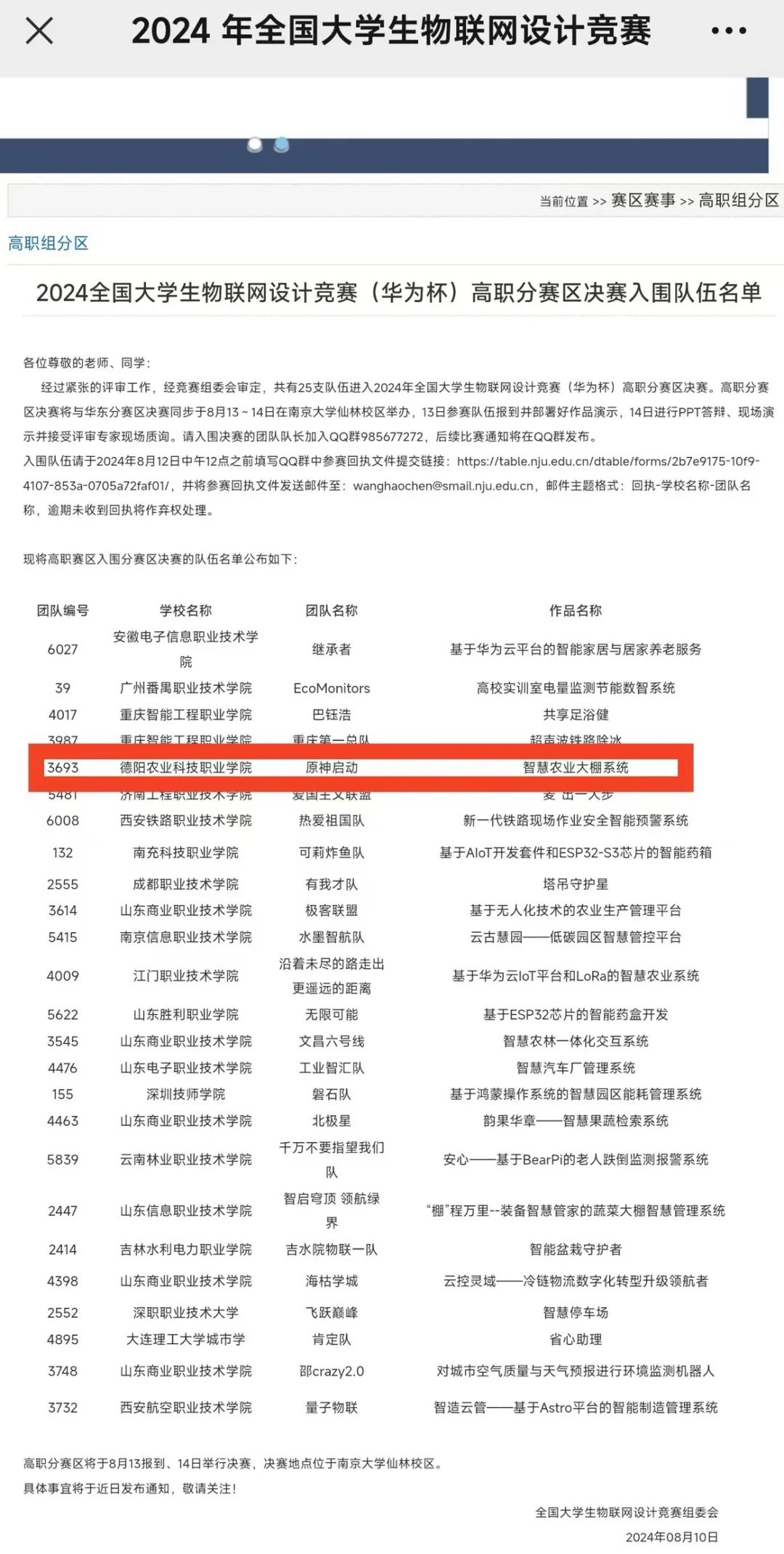 近日,由全国高等学校计算机教育研究会主办的2024全国大学生物联网设计竞赛(华为杯)高职分赛区决赛获奖名单发布,我校信息与建造工程学院学生李津津、姚辉、陈果、粟思美,指导老师段灵杰、杨俊波、徐磊组成的参赛队伍厉戈秣马,全力备赛,披荆斩棘,以优异的名次闯入决赛。比赛经前期线上评审初赛,从报名参加的545支本科队伍和93支高职队伍中,筛选出156支本科队伍和25支高职队伍参加本次分赛区决赛。