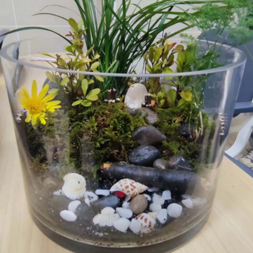 生态缸制作是依据生态学原理,在有限的空间内将生态系统的基本成分进行组织,构建一个人工微生态系统。学生们以活动小组为单位,分工合作,从建构生态系统所需要的成分、不同营养级生物之间的比例等方面进行设计,并动手制作。经过同学们不断的摸索探究、齐心合力,将各种元素浓缩在小小的生态缸中,经过巧妙构思、搭配组合,各种颜色彩砂富有层次的平铺在缸底,各种藻类植物在彩砂上“扎根”生长,鱼儿在水中自由自在的徜徉,构成了一幅幅栩栩如生的水中美景。