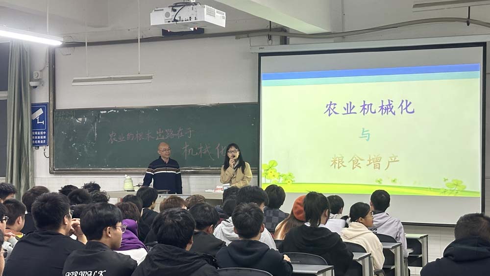 讲座中,林老师详细阐述了机械化耕作、播种、植保、收获及烘干等环节对增产的影响,并通过对比传统与现代机械化作业的效率和效果,生动展示了农业机械化如何助力粮食安全。他特别强调了“五良”融合——良种、良田、良制、良法、良机在现代农业生产中的关键作用,倡导同学们深入学习农机和农艺知识,为推动农业现代化贡献力量。