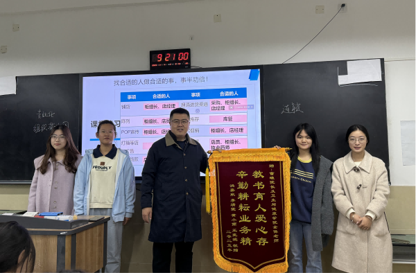 在全体师生的见证下,学生代表将锦旗郑重递交给曹院长,现场掌声久久回荡。这面锦旗,不仅是对学院教学成果的认可,更是对每一位教师默默奉献的真挚致敬。